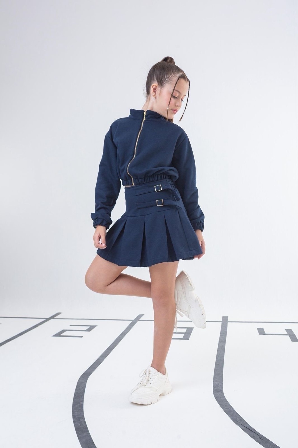 saia de pregas com fivelas laterais douradas ,com short interno.