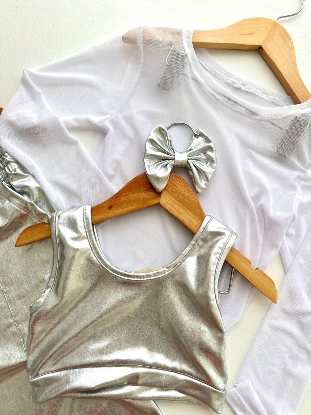 LOOK CALÇA MALHA METALIZADA COM TOP FORRADO( (OPCÃO PRATA OU PRETO), BLUSA TULE TRANSPARENTE (OPCÃO BRANCA OU PRETA).