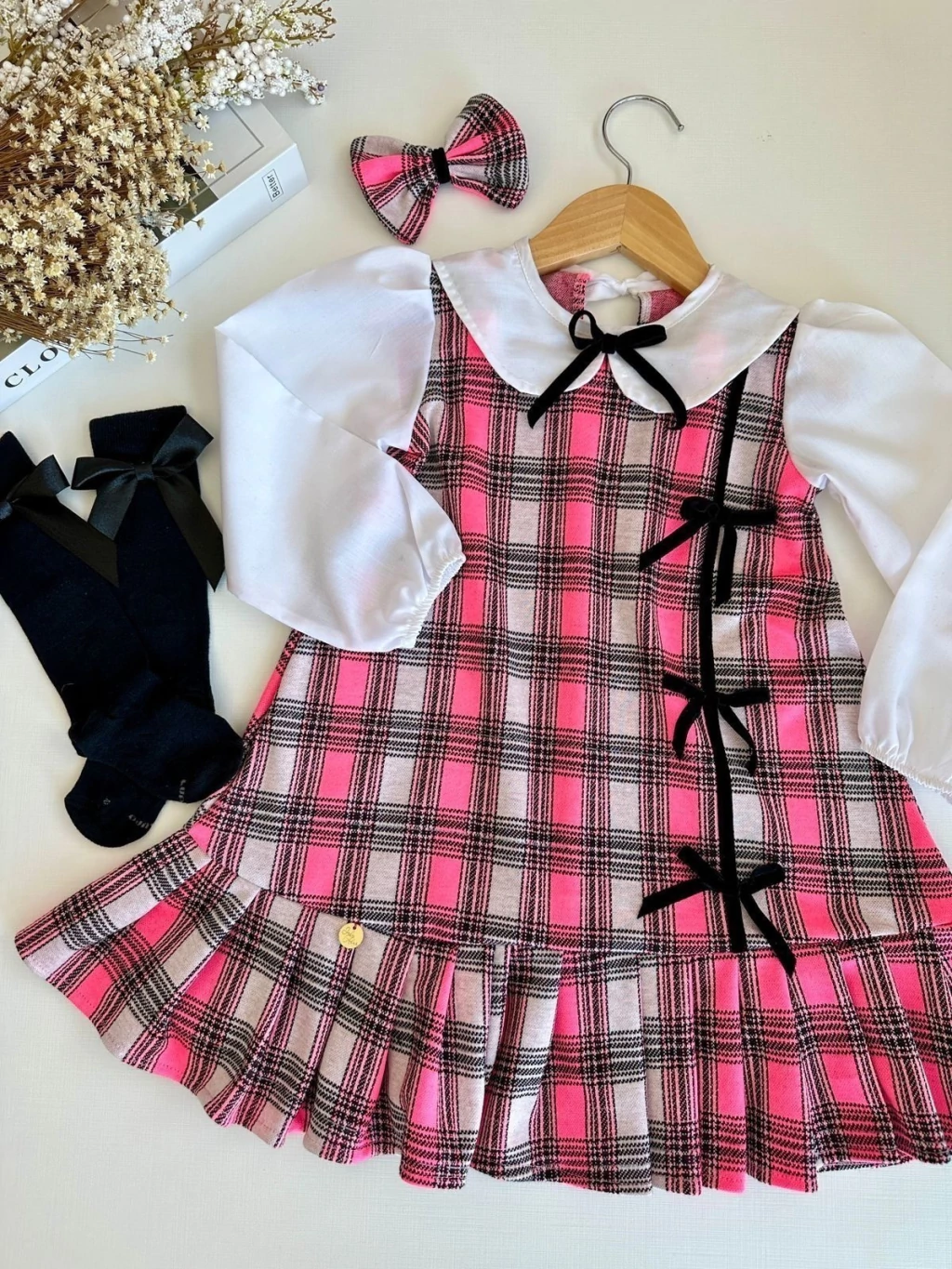 Para completar o charme, o vestido traz laços em veludo e um laço de cabelo combinando, criando uma combinação perfeita que encanta e valoriza o visual. Ideal para quem busca um look encantador, sem abrir mão do conforto.