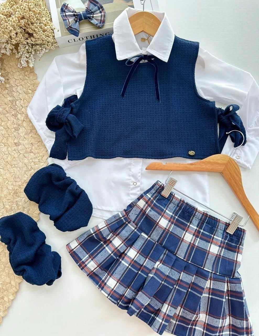 CAMISA EM TRICOLINE ALGODÃO, COLETE EM MALHA JACARD, SAIA EM XADREZ ALGODÃO, ACOMPANHA LAÇO DE CABELO E BROCHE DA CAMISA.