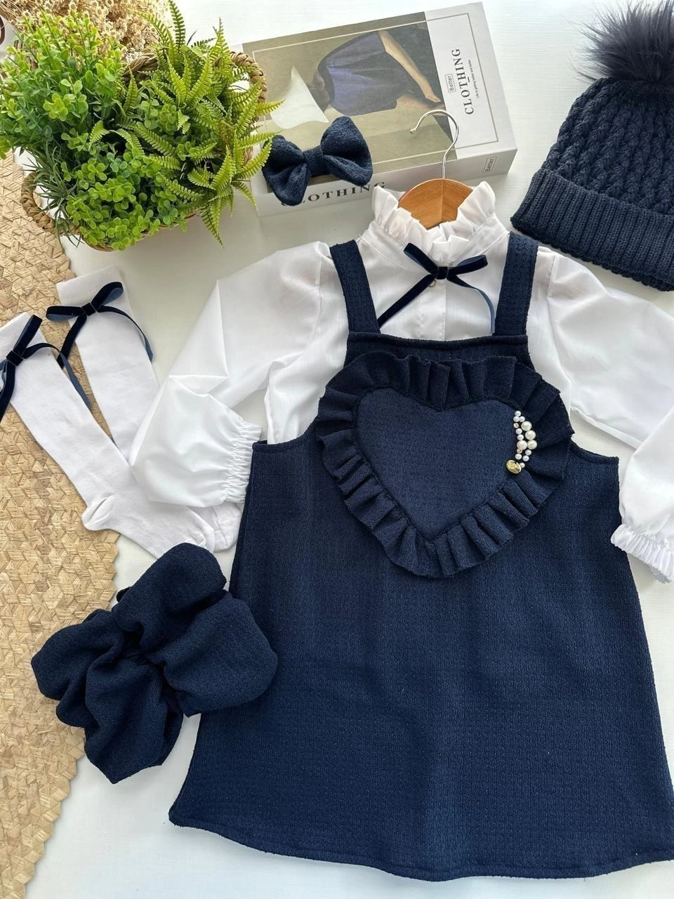 CAMISA EM TRICOLINE ALGODÃO, SALOPETE EM MALHA JACARD, COM BORDADOS DE PÉROLAS . E LAÇO DE