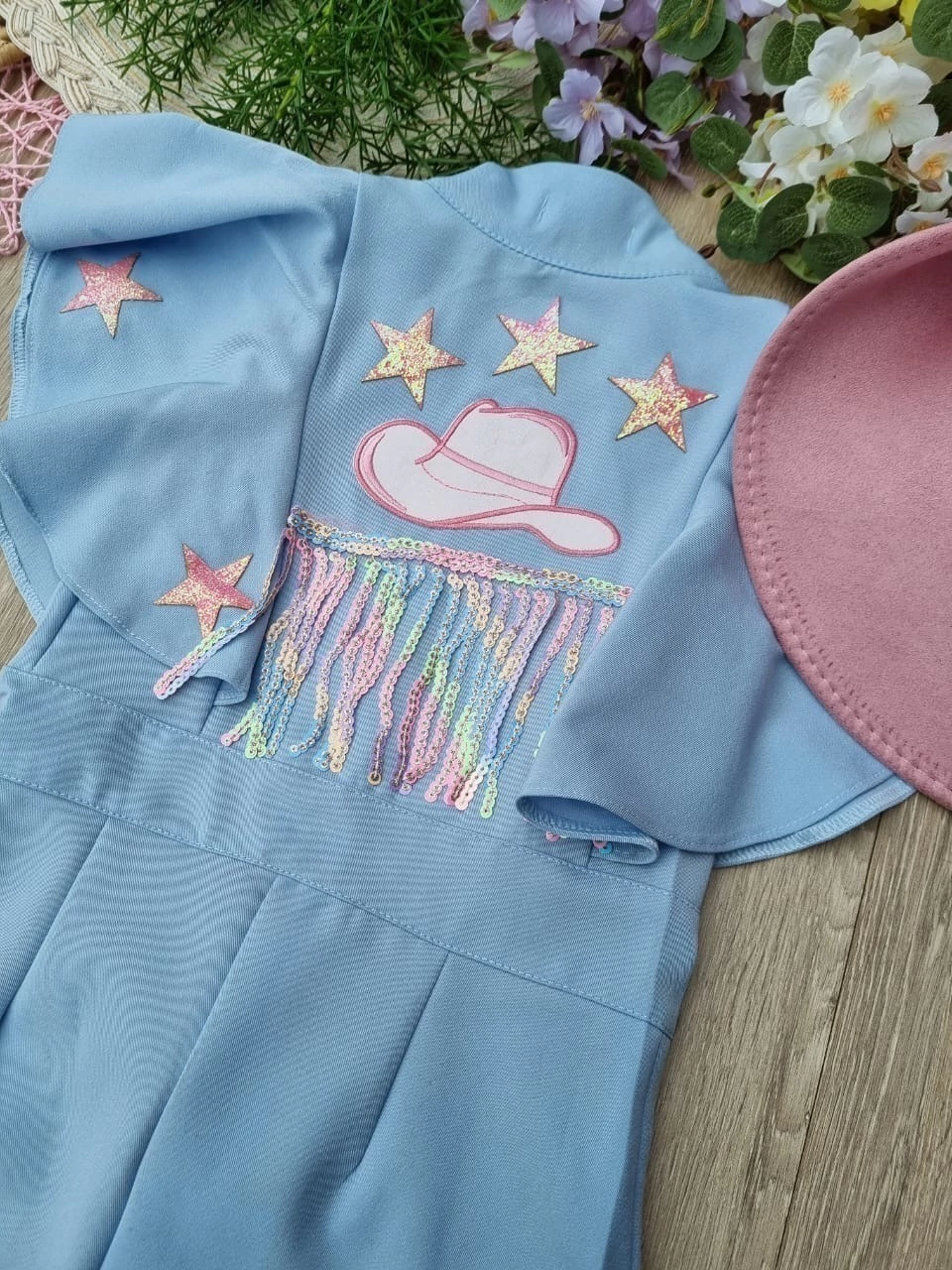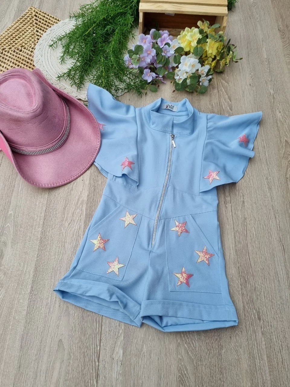 Macacão de shorts e manga de babados e franja, estrelas de brilho, feito em barbie span com elastano. Confortável com estilo único!