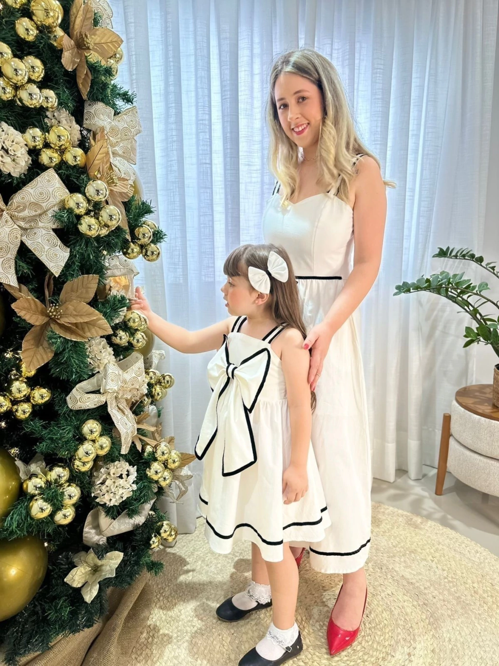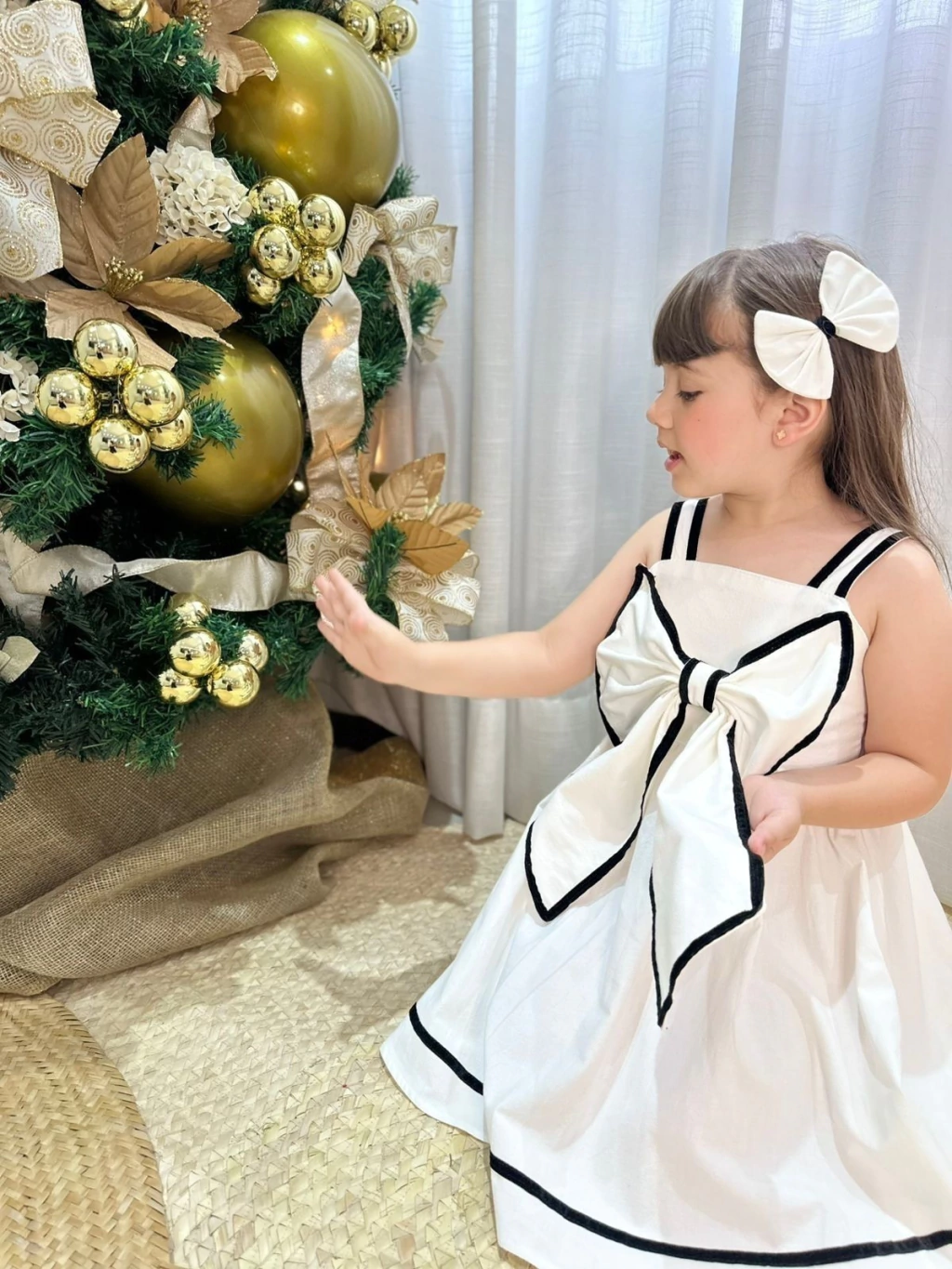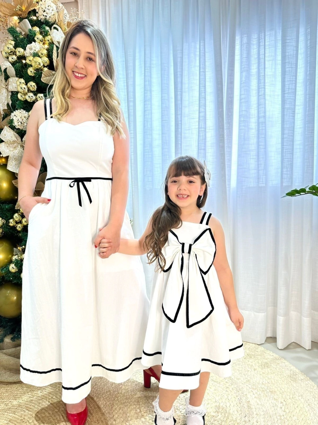 Vestido 100% algodão na cor Off white, com detalhes na cor preta e lastex na costa para melhor ajustar ao corpo. Vestido adulto com forro e bolso e vestido infantil com laço removível.